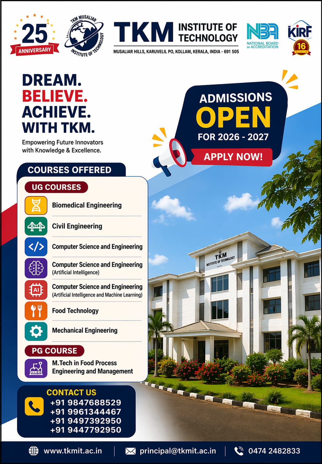 For more details contact: 9847688529, 0474 – 2482833, 2482083 (Office).